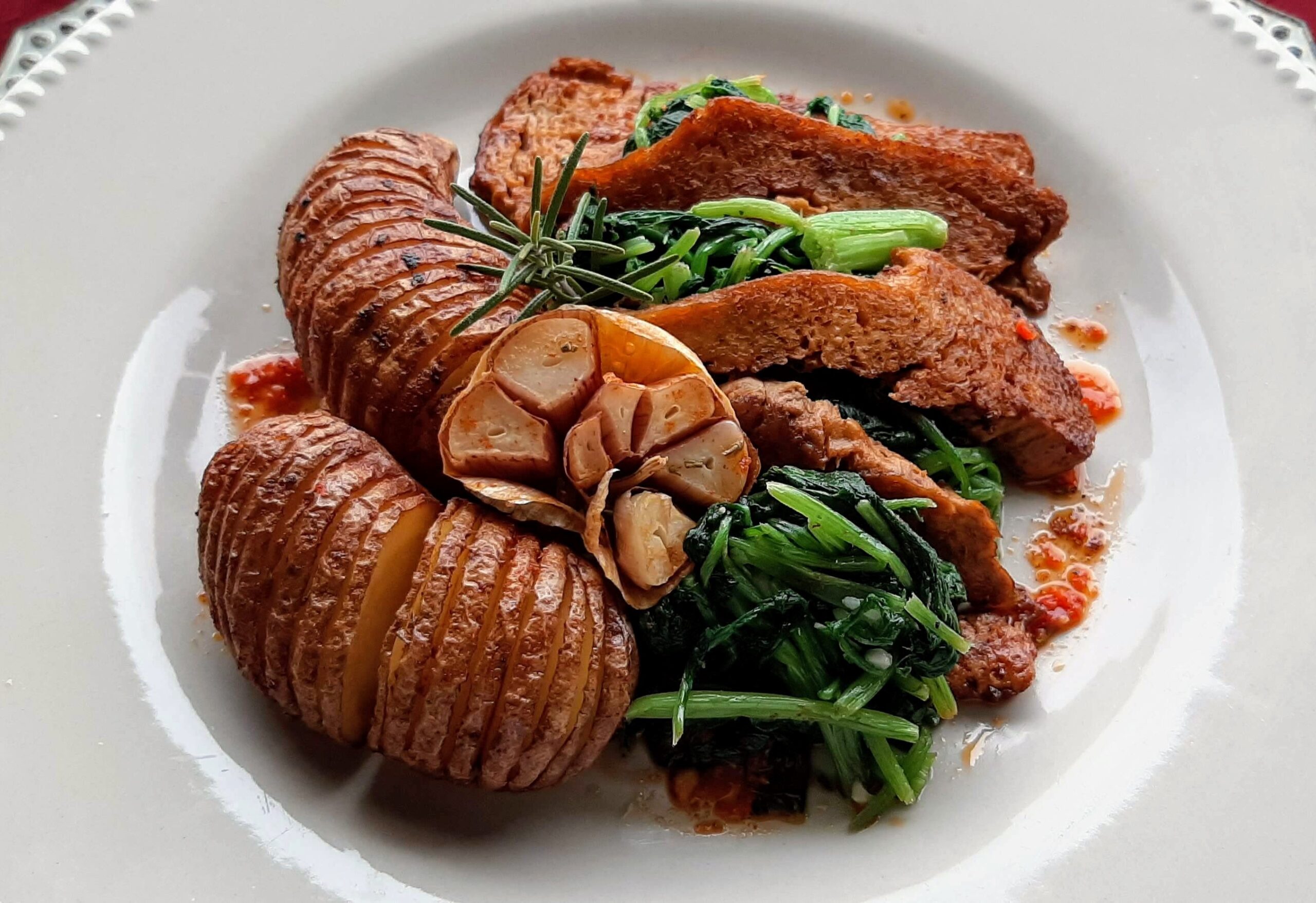 Seitan aconchegado nas nabiças ao alho e batata Leque, com salpicos de azeite de pimento vermelho